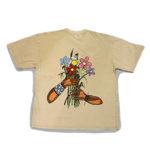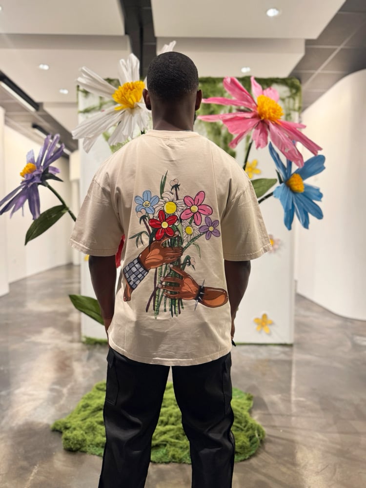 as seen at his most recent pop up event, titled “Seedz To Grow” this beige washed oversized t-shirt is a statement piece, inspired by the event and his recent work. Front is detailed with signature flower in top right corner while the back is an oversized work of art that includes various signature flowers.